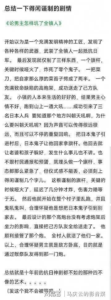 韩国“东莫村”的村民们可以全体上阵,前仆后继。苏联“哥萨克村”的村民们,可以全歼二百敌寇。这就是全民之血性。反观《得闲谨制》,就剩下嘲笑我民族之人民没血性了,对于抗战之群像戏,不愿意更多展示,只愿意给肖战镜头,给肖战镜头,给肖战镜头——把抗战戏拍成偶像剧,这是编剧导演之耻!(文/马庆云)