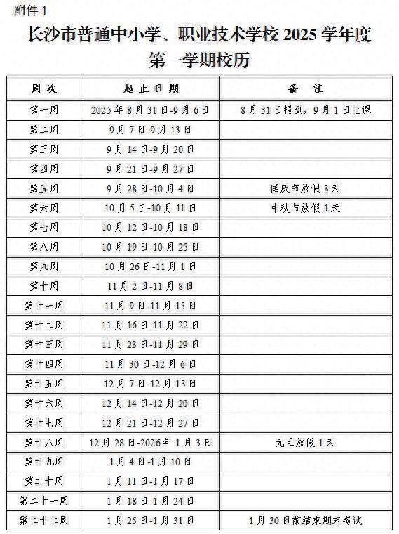 2025年9月1日上课,2026年1月31日结束,全学期共22周。寒假从2026年2月1日开始,3月3日结束。